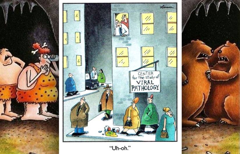 La fisiopatía es el miedo extremo a la enfermedad, tanto el riesgo de contraer una enfermedad como las consecuencias si lo hace. La tira de Larson imagina un mundo en el que los científicos que experimentan con virus mortales son lo suficientemente descuidados como para terminar dejando caer su muestra de una ventana, desatando instantáneamente en un mundo desprevenido. Una de las razones por las cuales los cómics como este leen como comedia en lugar del horror es porque Larson contrasta situaciones increíblemente serias con reacciones principalmente bajascomo un hombre que puede haber condenado a la humanidad reaccionando con, “Uh-oh”.