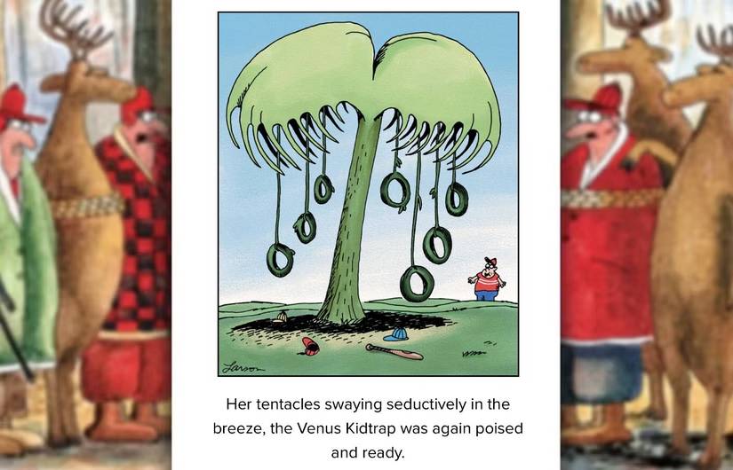 El humor de Gary Larson nunca es lo que parece, por lo que tiene sentido que El lado lejano está lleno de disfraces y camuflaje diseñado para engañar a simple vista. Desde plantas mortales que intentan atraer a presas hasta zoólogo que estudian animales de cerca y personalmente, Lado lejano está repleto de personajes que están sacando uno rápido.