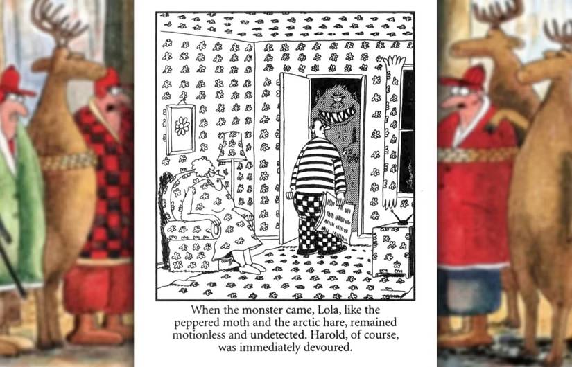 En esta genio franja cómica, una mujer que usa el mismo patrón que su papel tapiz termina sobreviviendo debido al efecto de camuflaje que crea. Larson hace hilarantemente para que ‘Harold’ no solo no use el mismo camuflaje, sino que lleva un atuendo ecléctico con pantalones de tablero de ajedrez y una camisa de rayas, nunca tuvo una oportunidad. Larson también muestra su amor por el lenguaje con la hilarante frase “Como la polilla salpicada y la liebre del Ártico”, ” Mantenga las cosas surrealistas ofreciendo ni siquiera una migaja de contexto de por qué un monstruo va de puerta en puerta comiendo personas.