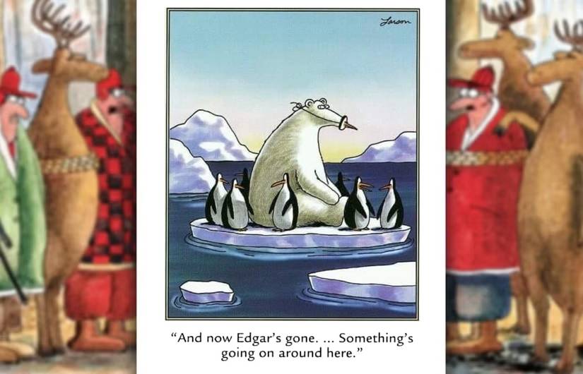 A veces, un disfraz no tiene éxito por su calidad inherente, sino por la opaca de su objetivo. En este caso, un grupo de pingüinos está siendo eliminado uno por uno, incapaz de adivinar al perpetrador a pesar del hecho de que hay un gran oso polar en medio de un pico falso mediocre. En La prehistoria del lado lejanoLarson señala que dobló la realidad al representar osos polares y pingüinos cuando realmente ocupan los extremos opuestos de la tierra. Abra la galería de imágenes a continuación para más Lado lejano Comics protagonizando pingüinos.