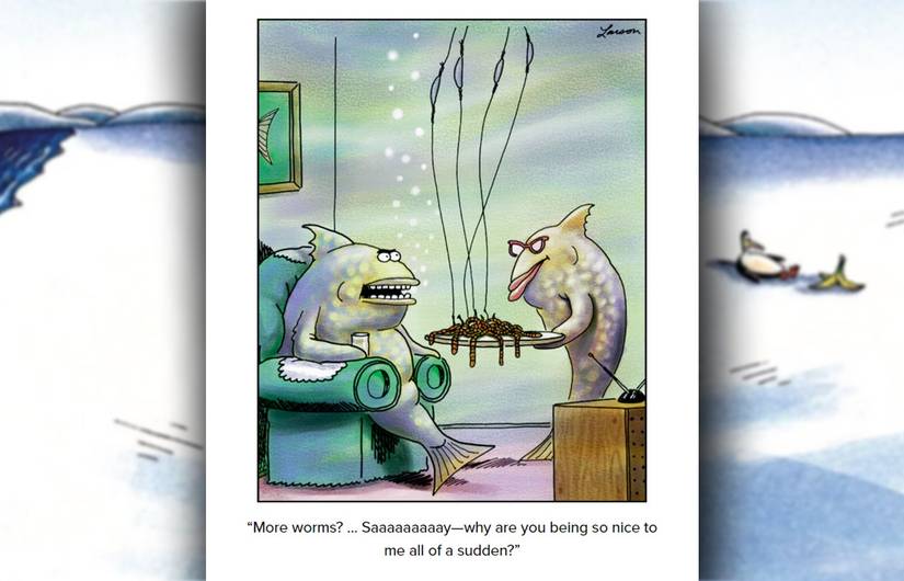 En este cómic, un pez le da a su esposo un buen plato de gusanos, que le parece muy dulce, quien se sorprende al ver que está recibiendo aún más gusanos. Poco se da cuenta de que los gusanos están unidos a los ganchos, revelando que el pez de la esposa tiene algunos planes tortuosos en sus branquias.