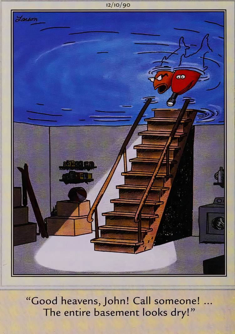 Por lo general, un sótano húmedo sería un problema porque indica una fuga o agua que se filtra en la casa. Sin embargo, para los peces, lo contrario es cierto: sería un problema grave si su sótano estuviera seco, ya que sus hogares deben estar mojados a toda costa para sobrevivir. En este escenario, algunos peces se encuentran frente a una crisis de reparación del hogar cuando miran su sótano y se horrorizan al verlo completamente secoinmediatamente exigiendo que alguien solucione el problema.