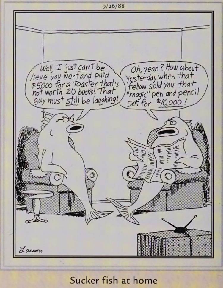 Pagar $ 5,000 por una tostadora es indignante y ciertamente merece el “Pescado de sucker” apodo. Peor aún, uno de los peces pagó $ 10,000 por una pluma mágica y un lápiz, haciéndolos extremadamente crédulos. En lugar de discutir el uno con el otro acerca de caer en diferentes estafas, podrían soportar ganar algo de inteligencia en la calle.