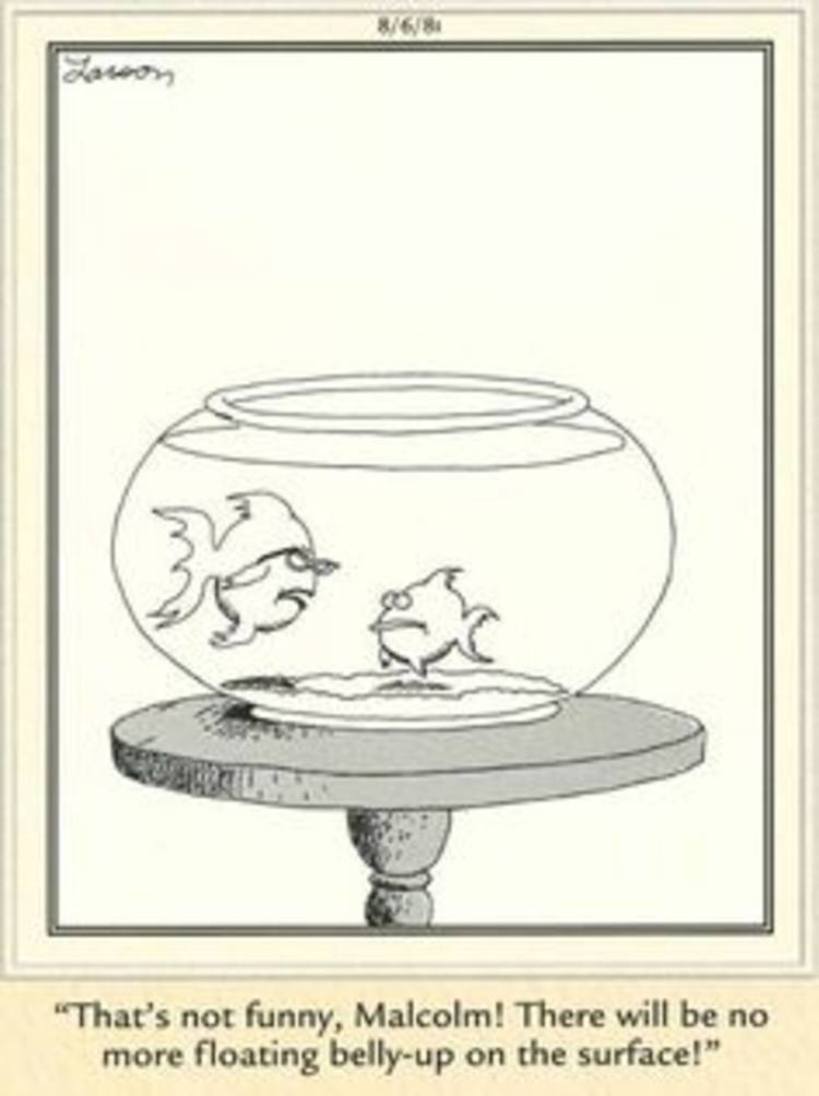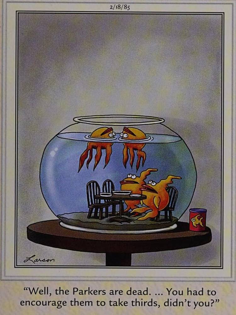 La gente advierte contra la sobrealimentación de los peces, y esta tira cómica proporciona un marcado recordatorio de los peligros de sobrealimentar, incluso en El lado lejano. Al igual que los humanos tienen amigos para cenar, estos peces también lo hacen. Sin embargo, uno solo puede esperar que el resultado sea mucho más feliz para las homólogos humanos que tienen compañía en exceso.
