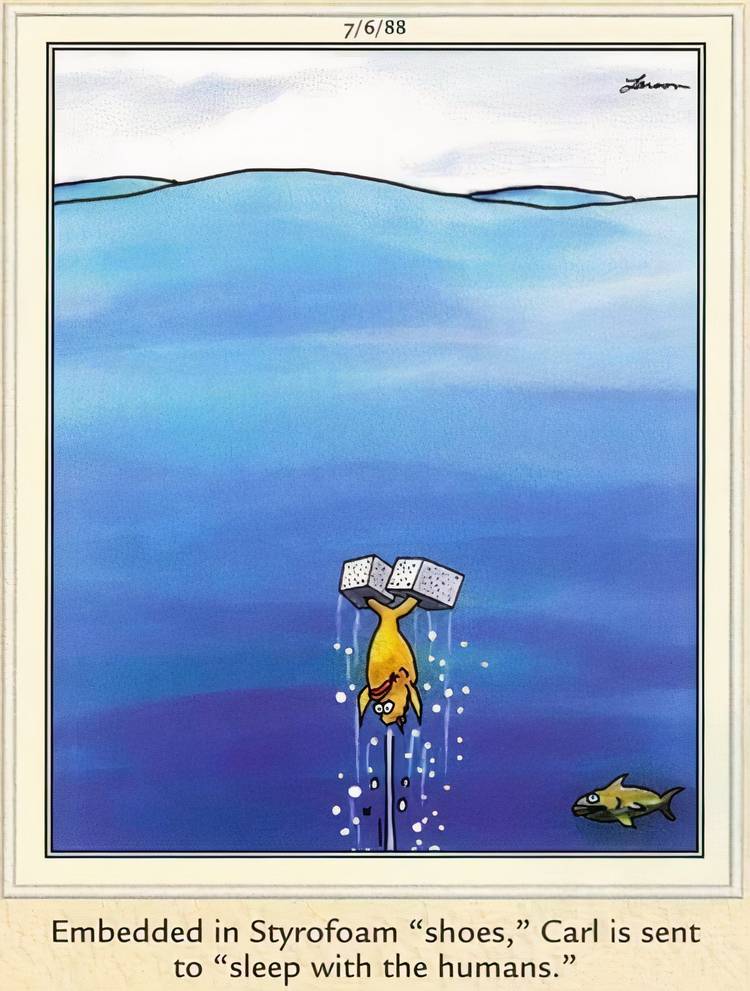 Este El lado lejano La tira cómica imagina una versión de peces de esa frase. La espuma de poliestireno ayuda a los peces a flotar directamente a la superficie rápidamente, pero es un desastre para los peces, que no podrá respirar sobre la tierra entre los humanos. Como resultado, la versión de peces de las consecuencias negativas para involucrarse en situaciones sombreadas requiere espuma de poliestireno en lugar del método humano habitual de bloques de cemento.