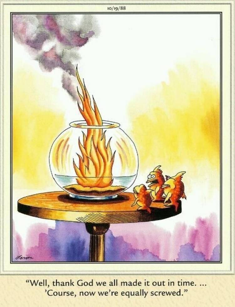 Tres peces se encuentran mirando el interior de su casa inexplicablemente en llamas, aliviados de que todos lograron escapar antes de lastimarse. Sin embargo, ahora que están fuera de la pecera y sin el agua que necesitan para sobrevivir, se dan cuenta de que están en serios problemas. El lector nunca aprende qué causó que el pez se incendiera, lo que se suma a la naturaleza ya surrealista del cómic, especialmente con los peces parlantes y vertiginosos.