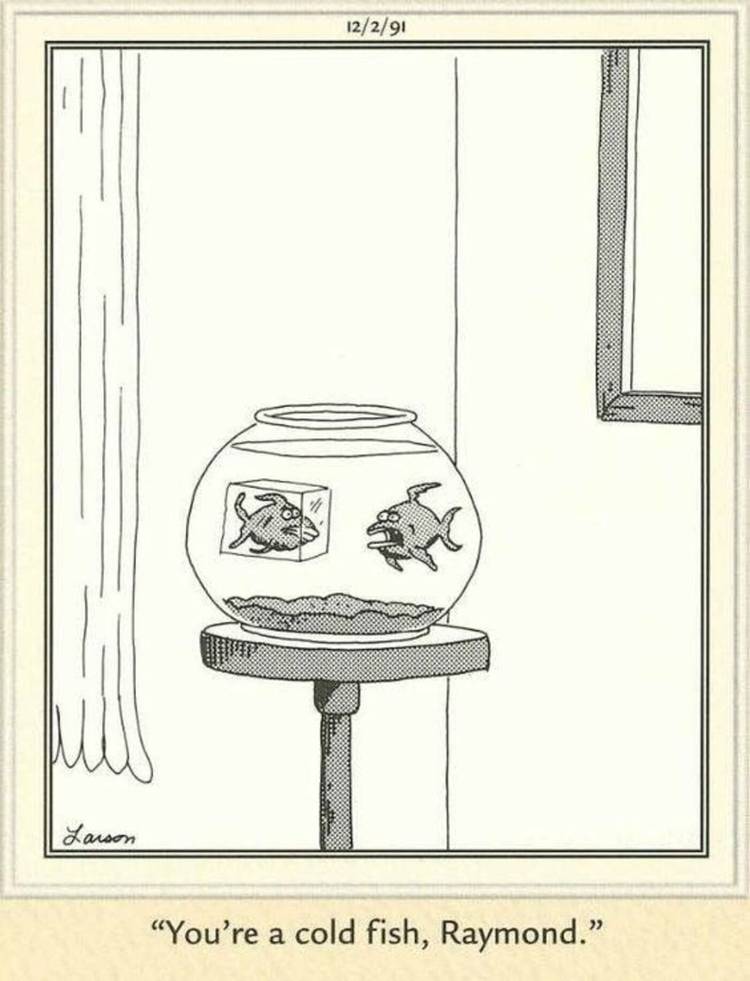 En este caso, Raymond El pez logra encarnar ambas definiciones de un “Pescado frío” Como está literalmente encerrado en hielo, mientras que su compañero de cuarto de peces no parece llevarse bien con él demasiado bien. Gary Larson era un maestro de juego de palabras, y este doble significado de “Pescado frío” emparejado con una mordaza visual es un ejemplo perfecto de El lado lejano brillantez.