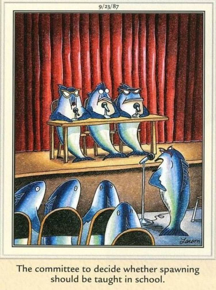 El desove es el equivalente de peces de cómo se hacen los bebés, y es un tema candente entre los padres de los peces en El lado lejano. Esta tira cómica no sería la primera vez El lado lejano ha tomado problemas sociales de los hotes o los eventos actuales y los ha volcado a una versión del mundo al revés y al revés, reemplazando a los humanos con peces.