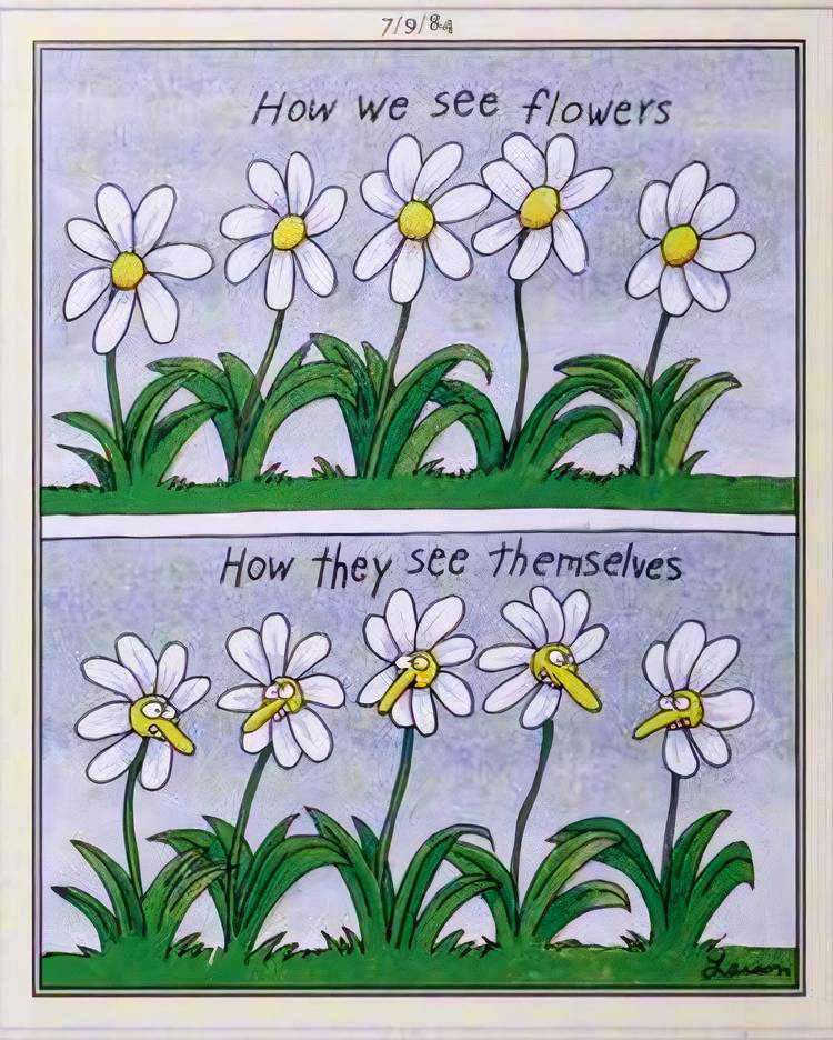 Gary Larson ama la naturaleza y con frecuencia la usaba como escenario y, ocasionalmente, el tema de El lado lejano. Aquí, Larson se toma un descanso de su estructura habitual de un panel para mostrar dos paneles, uno que demuestra cómo la gente ve flores (sin nada especial en ellos). El segundo panel muestra cómo las flores se ven a sí mismas, cada una con una cara y personalidad únicas. Es una linda tira, y realmente hace que uno contemple la singularidad de todo. Es fácil agrupar las cosas, pero la verdad es que el mundo en el que todos viven es mucho más único de lo que las personas comprenden.