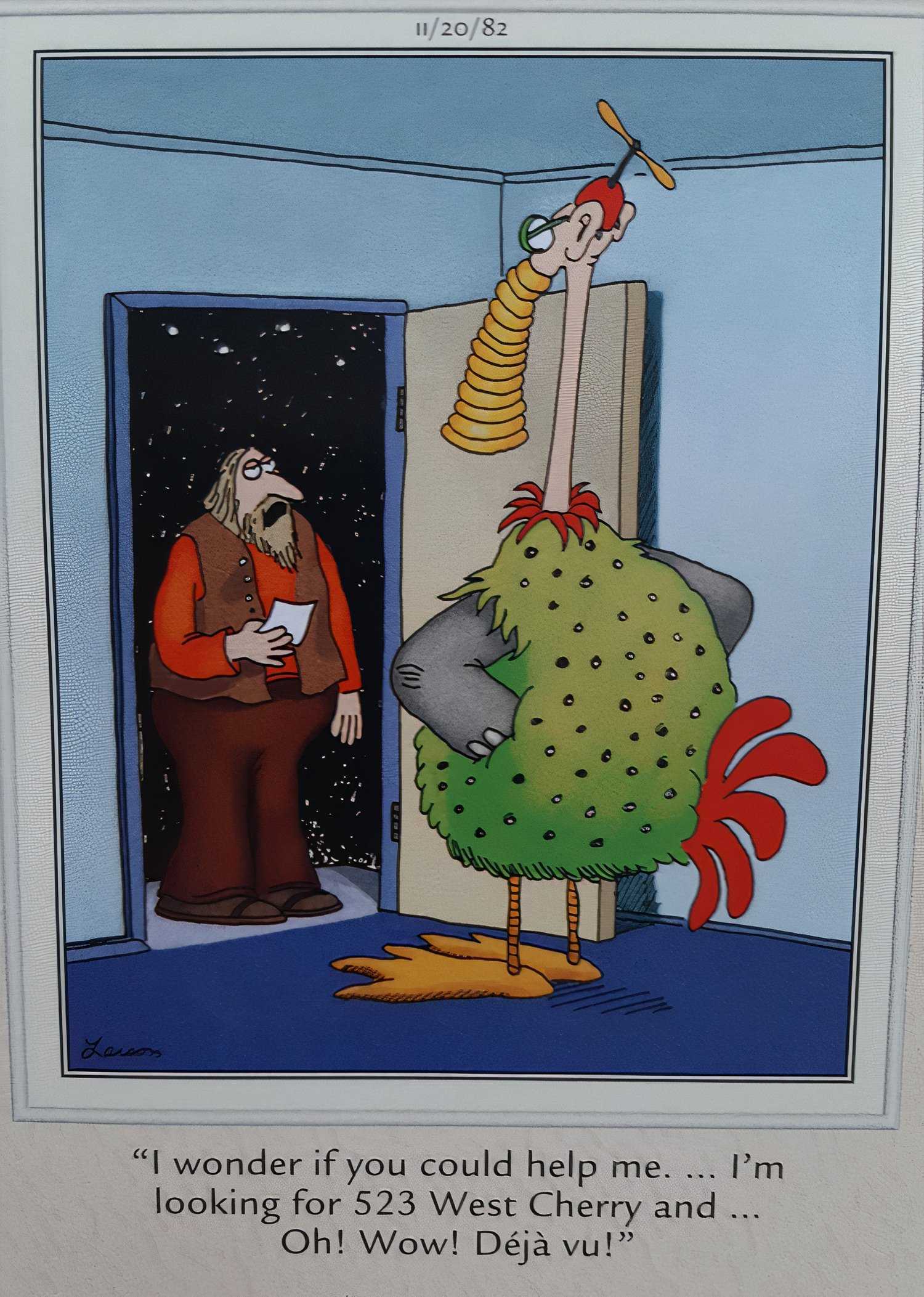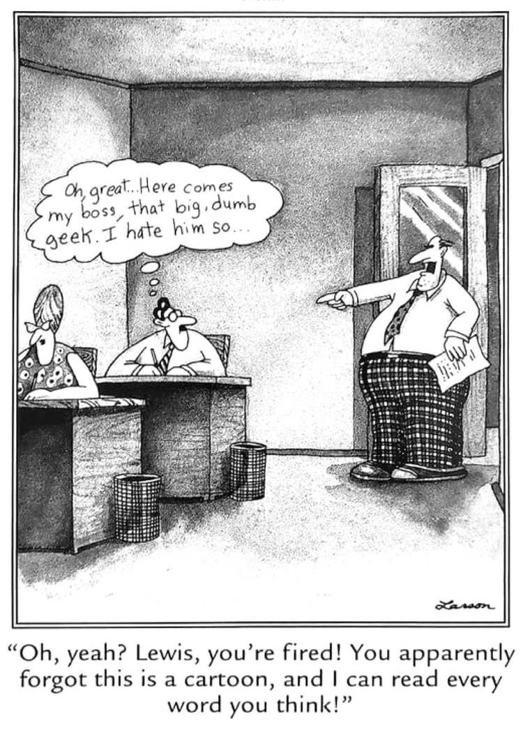 Larson a menudo deleitaba a los lectores con su meta humor, y pocas tiras lo logran así como esta. Su jefe se acerca a un hombre, y comienza a pensar en un montón de insultos, solo para ser llamado por su jefe, ya que, como dibujos animados, sus pensamientos pueden ser leídos. Es una gran metaetería, pero está casi preparado para que los lectores comiencen a adivinar sobre su propia realidad. Después de todo, si este jefe pudiera leer los pensamientos de su empleado, ¿quién puede decir que no se pueden leer otros pensamientos? Suena loco, claro, Pero loco es solo otro día en El lado lejano.