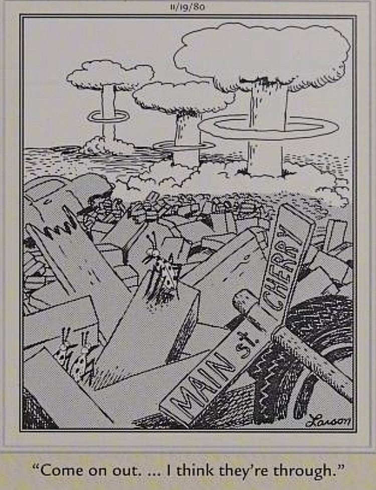 Larson no tenía miedo de burlarse de la idea de que la humanidad iba a ser responsable de su desaparición. Y en esta tira, El lado lejano No se detiene, mostrando que la civilización se ha derrumbado por completo a raíz de la guerra nuclear. Sin embargo, los errores han seguido sobreviviendo y están preparados para hacer sus vidas ahora que los humanos terminan. Divertido, pero definitivamente desconcertante. Claro, hay un pequeño consuelo al saber que la vida continuará a raíz de la humanidad que se destruye a sí misma, pero viendo que se desarrolla tan directamente en un Lado lejano La tira es suficiente para hacer una pausa.
