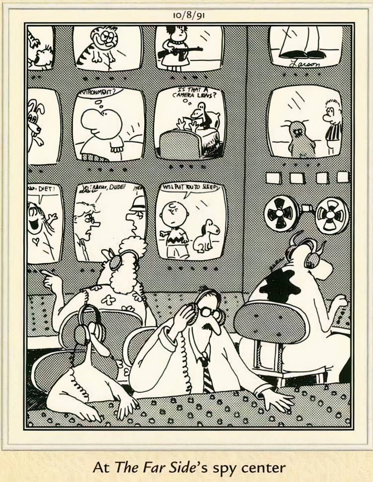 El lado lejano Seguro que me encantaba burlar ocasionalmente sus rivales. Aquí, los lectores echan un vistazo a El lado lejano ‘Spy Center’, que muestra varios caracteres de la tira vigilando la competencia, como Garfield y Charlie Brown (que amenaza con poner a los pobres a dormir). Tiene ese humor negro habitual El lado lejano es conocido porpero también es un recordatorio inquietante. Después de todo, en el siglo XXI, ¿alguien puede estar 100% seguro de que no está siendo observado por alguna parte para algún propósito desconocido, o posiblemente incluso nefasto?