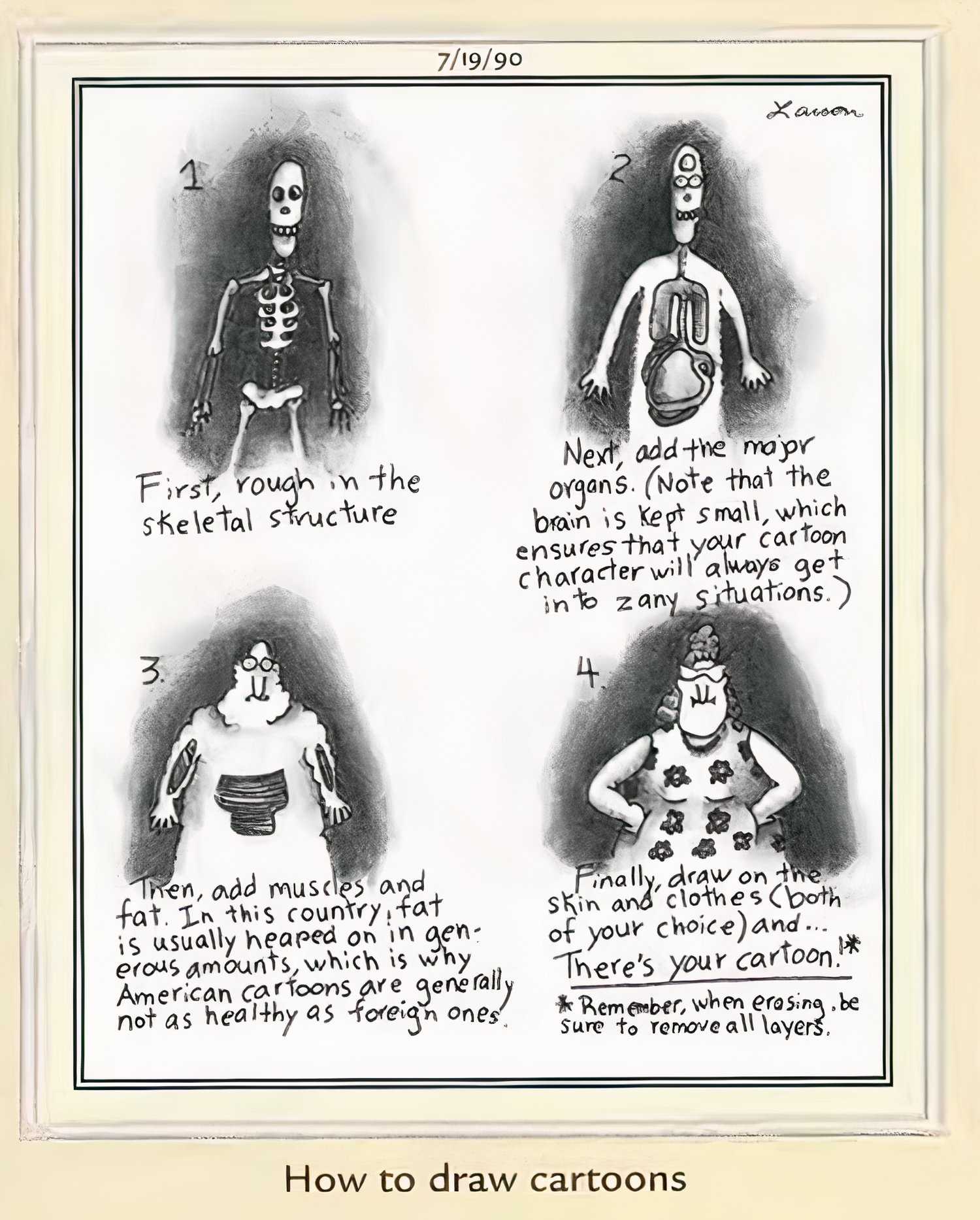 El lado lejano A menudo trata a sus personajes como más ‘reales’ que la mayoría de las otras tiras cómicas. Nada muestra algo mejor que esta lección sobre cómo dibujar por Gary Larson. Pero en lugar de construir a sus personajes a partir de formas y líneas, El lado lejano Band of inadits está diseñada desde adentro hacia afueradesde el esqueleto hasta la piel. Hilarante, pero realmente hace que uno piense en los personajes que percibimos como ficticios. ¿Son tan reales como la gente? Y si lo son, ¿qué hace eso a las personas en el “mundo real”? Un verdadero rompecabezas cuanto más uno piensa en eso.