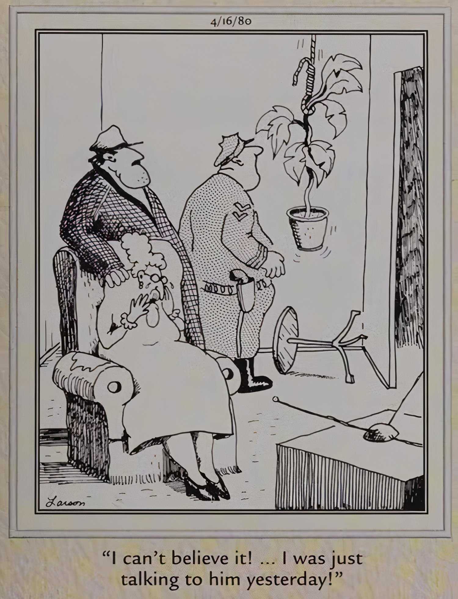 A Larson le encantaba antropomorfizar todo, desde animales hasta objetos cotidianos. Aquí, El lado lejano Mastermind lleva el concepto de ‘colgar plantas’ al más extremo y tiene una planta doméstica común que se suicida a través de una soga, mientras que el propietario de la planta explica la situación a las autoridades. A pesar de ser literalmente el humor de Gallows, uno debe preguntar cómo podría ocurrir este tipo de situación. Es esto normal en El lado lejano? ¿O son los lectores los locos por no sentir empatía por la planta? El lado lejano tiene una forma extraña de ampliar las perspectivas de sus lectores en el mundo que los rodea.