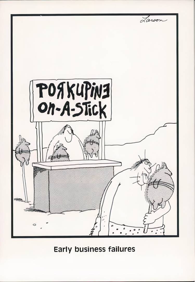 La prueba y el error son simplemente una parte de la ejecución de una pequeña empresa. Pero como suele hacer El lado lejano toma un aspecto negativo de la realidad y lo muestra al mundo a través de una lente increíblemente ilógica. En esta franja, un hombre de las cavernas corre un stand que ofrece ‘puercoespín en un palo’. La criatura no está cocida o incluso muerta. Simplemente está atado a un palo y se vende a otros hombres de las cavernas que, increíblemente, intentan comerlo. Leyendo apropiadamente ‘fallas comerciales tempranas’, esta es una forma hilarante de ver lo rudo que puede ser al tratar de perseguir el éxito.
