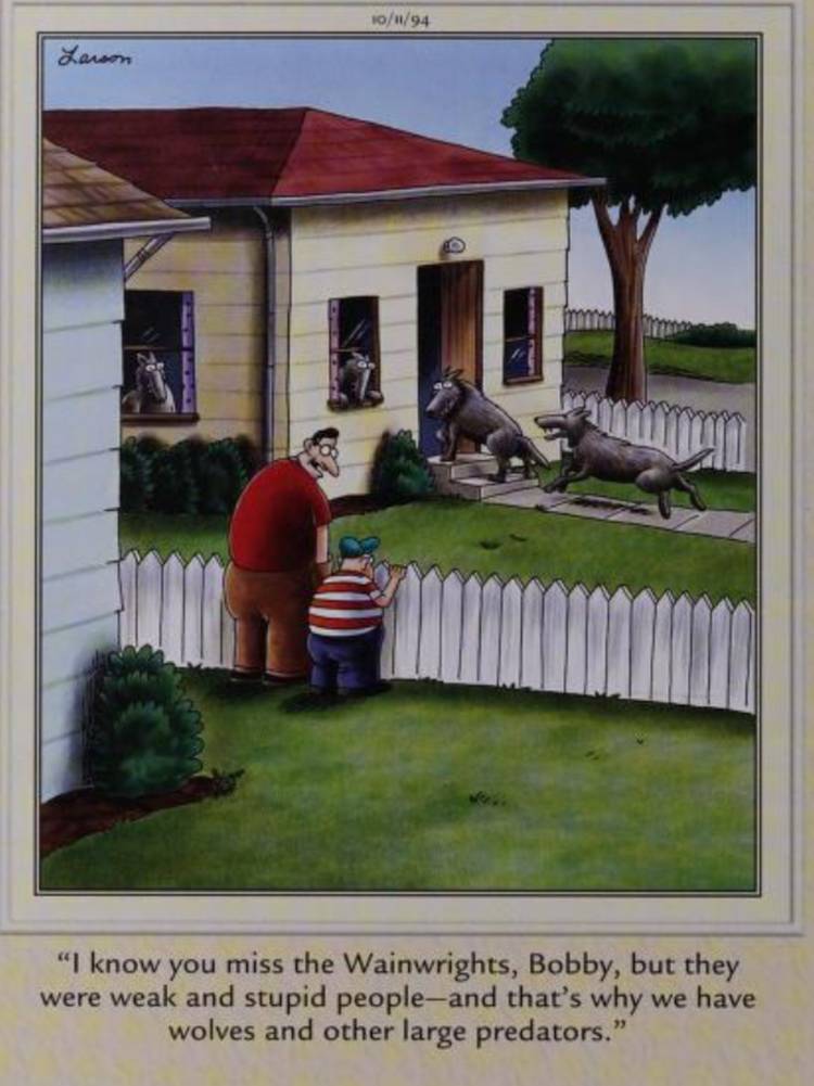 El darwinismo prevalece en cada parte de la sociedad. El concepto de supervivencia del más apto se asocia típicamente con animales que compiten por los recursos. Aún, Incluso en un escenario más común en el lugar de trabajo, es un mundo de perros-come-dog. Cada vecindario, incluso un suburbio, tiene un depredador alfa enfrentado a una presa manseña que decía que el depredador ve como objetivo. Esto es probablemente lo que sucede a la familia Wainwright antes de este cómic, y esa es la analogía que este padre esencialmente presenta a su hijo.