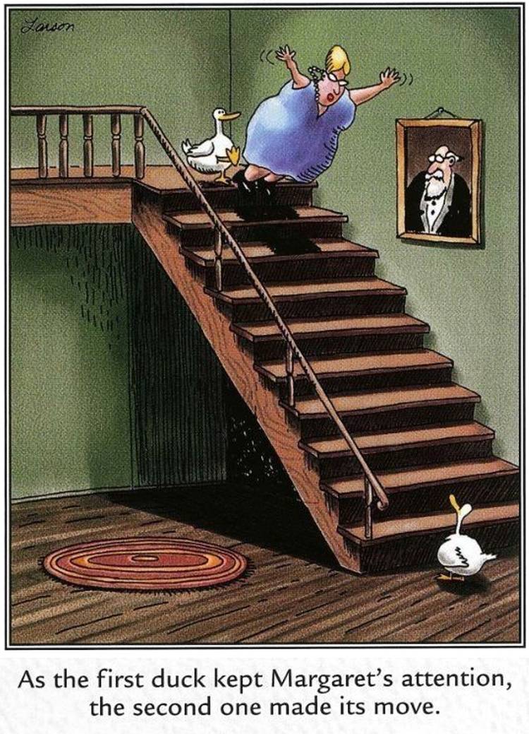 Este es uno de los cómics más inquietantes de Gary Larson, en gran parte porque carece de un frase clara. Si los patos fueran reemplazados por personas reales, la escena simplemente parecería una escena del crimen espeluznante. Aun así, representa un crimen, pero intercambiar patos por humanos crearía una imagen mucho más horrible, una sin el humor negro que viene de ver a los patos cometer un asesinato.