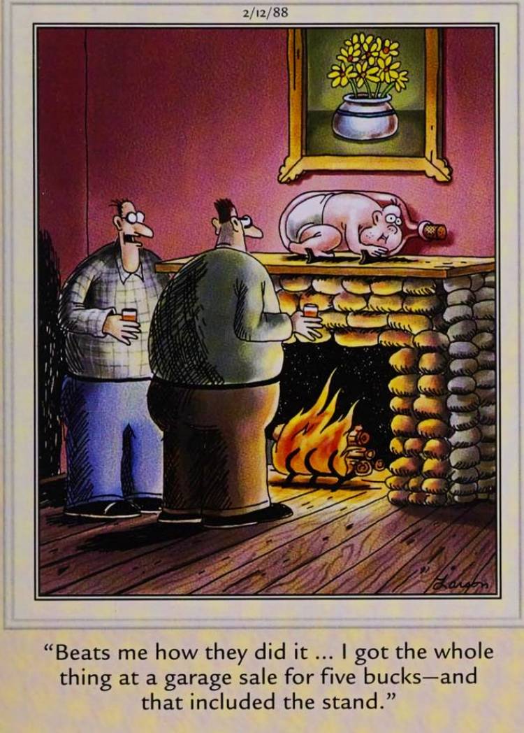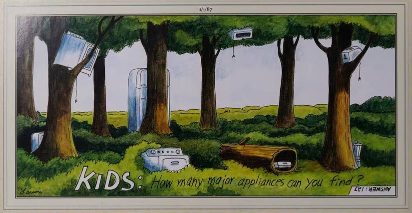 En este cómic, varios electrodomésticos, muchos de ellos grandes, están notablemente ocultos en diferentes partes del bosque para que los niños intenten contar. En la esquina, hay una clave de respuesta para el rompecabezas, alegando que hay 127 electrodomésticos en la imagen, un número que no coincide con lo que realmente es visible. Gary Larson creó el cómic como una broma sobre lo absurdo de los rompecabezas de la caza del tesorocon la tecla de respuesta no coincidente que es completamente intencional.