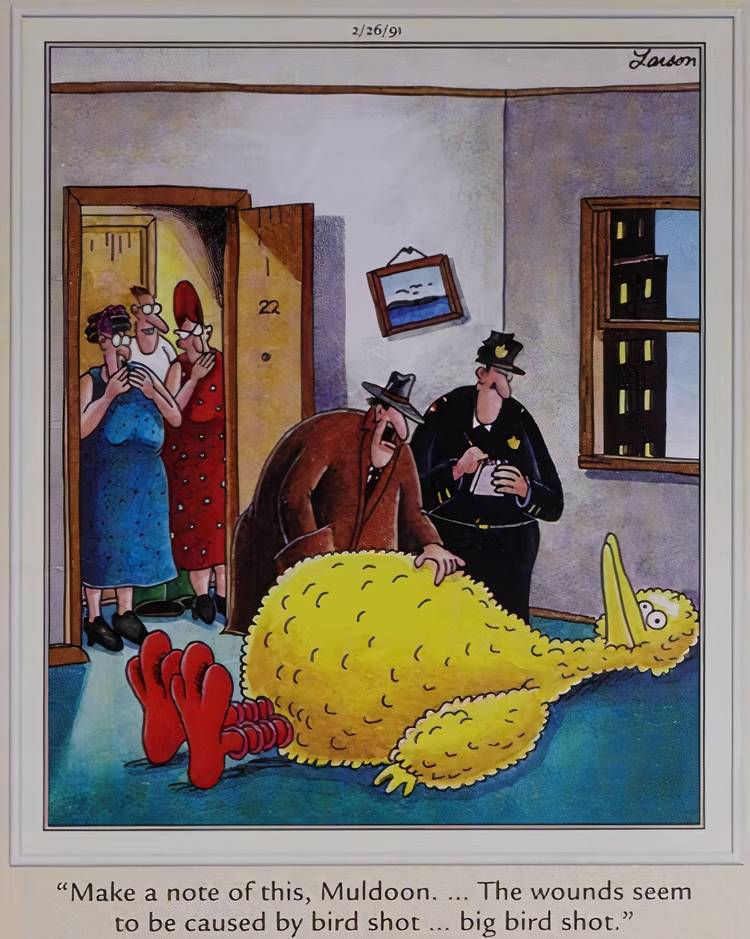 Un caso trágico que exige la presencia policial ocurre en El lado lejano Cuando un gran pájaro, El gran pájaro real, se encuentra muerto con una herida Eso lleva a la policía a sospechar que algunas aves, o más bien, pueden haber ocurrido un juego sucio. El lado lejano no es ajeno a incluir personajes de cultura pop en sus tiras cómicas, por lo que la aparición del clásico Sesame street El personaje no está completamente fuera de lo común para la serie escandalosa.