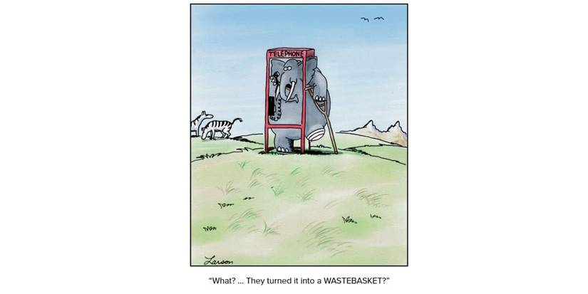 Un elefante, caminando con una muleta después de perder uno de sus pies, va a un teléfono público para recibir información importante y, en última instancia, angustiosa. Se le dice que el pie que le fue tomado se ha utilizado para hacer una quilatara.que enoja enormemente al elefante. La pérdida de su pie es lo suficientemente mala, pero para agregar insulto a la lesión, su parte del cuerpo se está utilizando como un receptáculo de basura, que lo perturba profundamente.