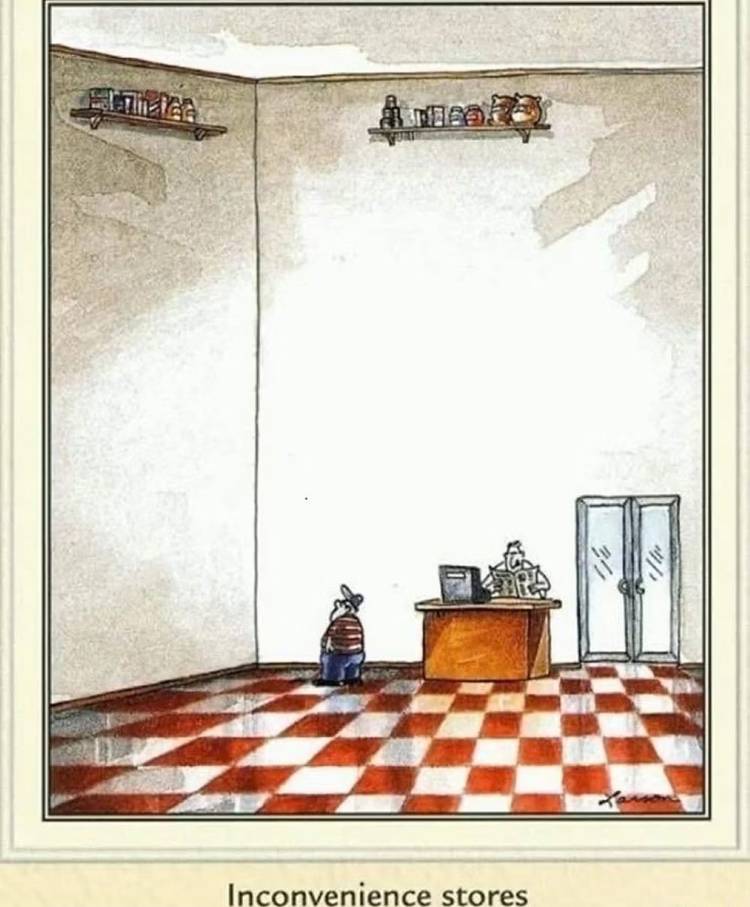 El lado lejano tiene muchas mordazas de un panel geniales que presentan un escenario sin palabras que golpean a los lectores con un frase inesperado. Aquí, un hombre está de compra, solo para descubrir que cualquier artículo que pueda desear está en un estante increíblemente alto. El subtítulo de esta tira informa al lector que lo que está viendo es en realidad un ejemplo de una ‘tienda de inconvenientes’. No solo es un buen riff en la frase ‘tienda de conveniencia’, sino que es una gran cosa llamar a cualquier tipo de tienda que haga las cosas increíblemente difíciles o imposibles para los clientes.