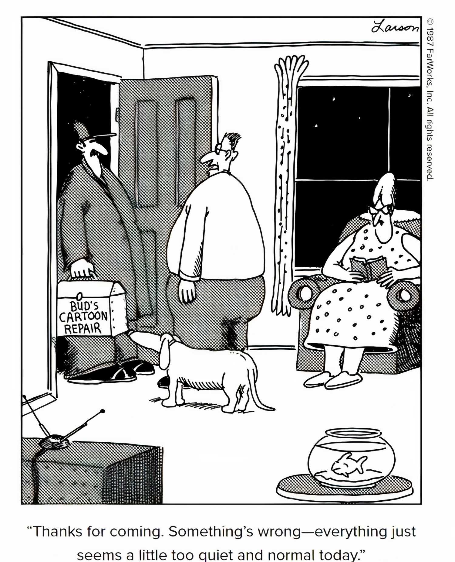 Larson siempre fue muy consciente de lo extraño El lado lejano el mundo era. Entonces, para cambiar las cosas, creó una franja humorística que no tiene nada fuera de lo común. Aparece un reparador, pero no para arreglar la fontanería o la televisión, sino la tira en sí, ya que es un reparador de dibujos animados. La cita de la tira “Todo parece demasiado tranquilo y normal hoy“Es lo perfecto para decir cuando alguien espera un caos absoluto, solo para encontrarse con una serie de eventos incómodos.