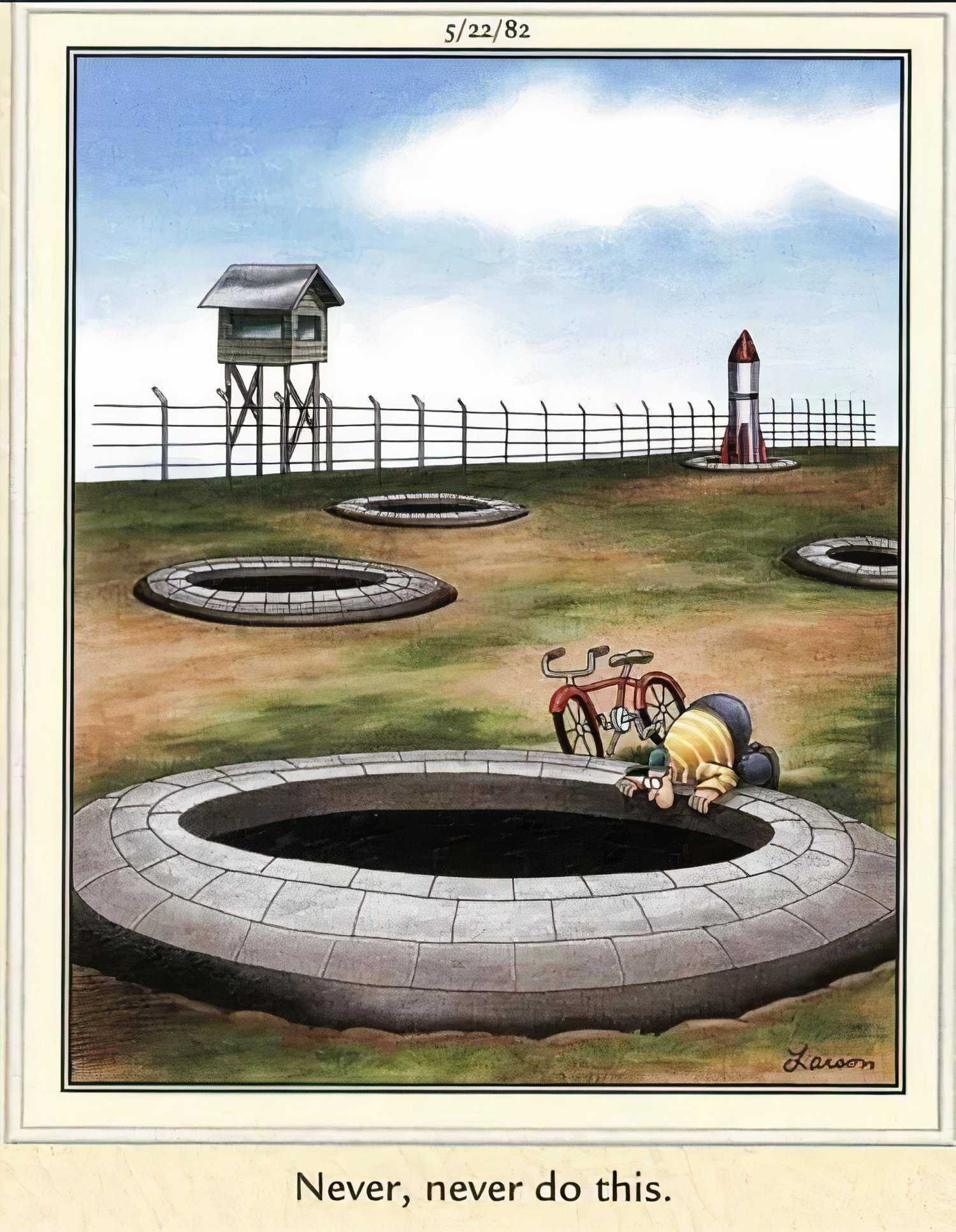 El lado lejano ¿No es un lugar para obtener consejos de vida?pero eso no significa que Larson pueda transmitir algún tipo de sabiduría. Aquí, un niño de alguna manera ha llegado a un campo con silos de misiles y no se da cuenta de ese hecho, pensando que son solo grandes agujeros para considerar. Sin embargo, en el fondo, los cohetes ya se están preparando para el vuelo, mientras que el subtítulo a continuación lee “Nunca, nunca hagas esto.“. Los niños a menudo no escuchan, pero con una cita como esta (y combinada con un escenario increíblemente exagerado, tal vez las generaciones más jóvenes estarán más inclinadas a escuchar.