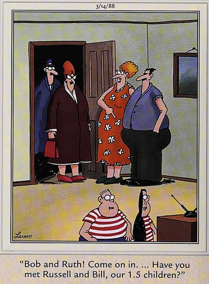 Representa un término medio, por así decirlo, al calcular hogares que pueden tener dos o tres hijos. No significa que una pareja en cualquier hogar tenga un hijo que solo cuenta para .5, pero si lo hizo, Gary Larson piensa que así es como se vería, tener medio hijos. Lado lejano Las familias pueden ser caóticas.