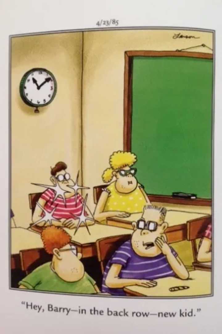 El lado lejano Hace que la escuela sea divertida y, en realidad, todos sus paneles histéricos cada vez que Gary Larson le pone dichos clásicos en la cabeza. Shiny y New adquieren un significado completamente nuevo cuando el nuevo niño llega con un nuevo brillo y un brillo de tinte. Es un brillo nuevo que solo se puede encontrar en la juventud.