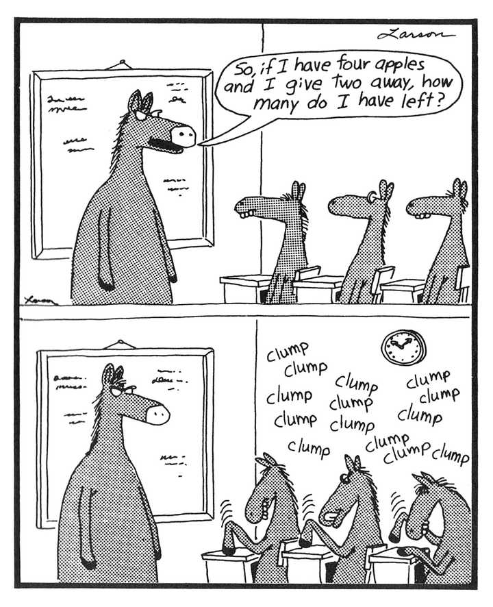 En uno de El lado lejano Comics raros sin subtítulos, un maestro de caballos lidera una lección de matemáticas para su salón de clases de potros, lo que los obliga a sujetar el escritorio. Algunos estarán perplejos por la noción cuando noten que los caballos no tienen computadoras o computadoras portátiles frente a ellos, pero esta es una broma gratificante para los conocedores de los caballos.
