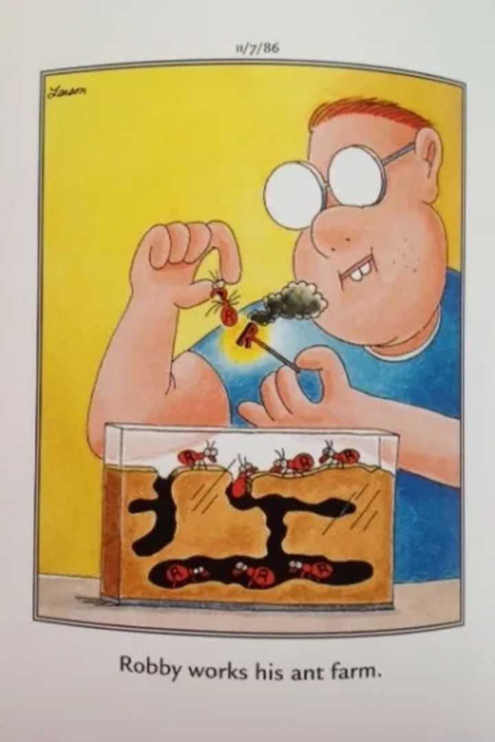 Tomemos a Little Robby, por ejemplo, quien toma la noción de mantener una granja de hormigas demasiado en serio, específicamente la parte agrícola. Al igual que un agricultor marca sus caballos, Robby marca su territorio en sus hormigas. Tal vez está practicando para ser un experto en agricultura inteligente cuando crezca. Es uno de los más divertidos Lado lejano cómics sobre hormigas.