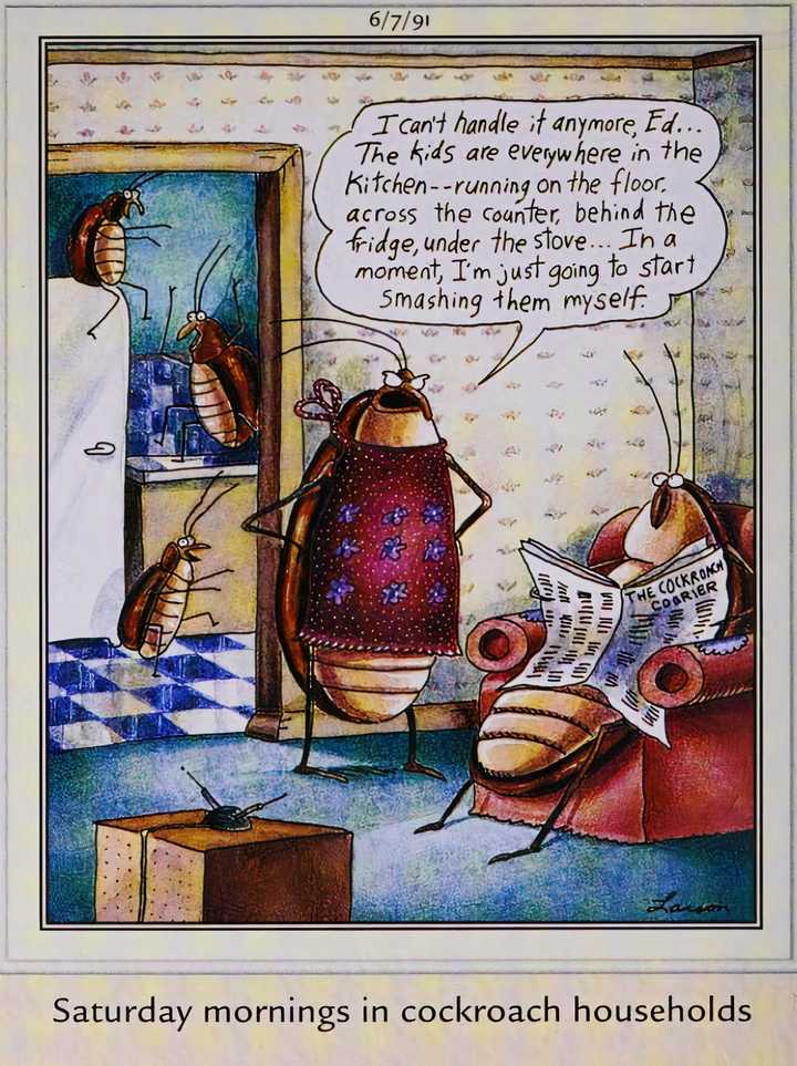 Mientras tanto, incluso con los padres de cucarachas, los padres todavía están corriendo por la pared, metafóricamente hablando, ya que sus hijos los están volviendo locos. Especialmente la madre, que se siente tentada a detener la locura al aplastar a sus hijos como un humano que una cucaracha invadía su hogar.