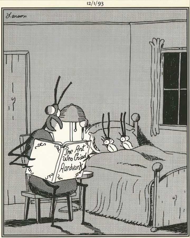 Para los niños de las hormigas, se les dice una historia de advertencia muy diferente, esta vez con el lobo reemplazado por Aardvarks, el depredador natural de las hormigas. Gary Larson ya ha dejado en claro que El lado lejano está obsesionado con los insectos, las hormigas en particular, y flexiona su conocimiento al ilustrar escenarios hilarantes.