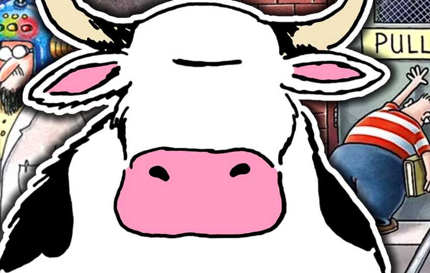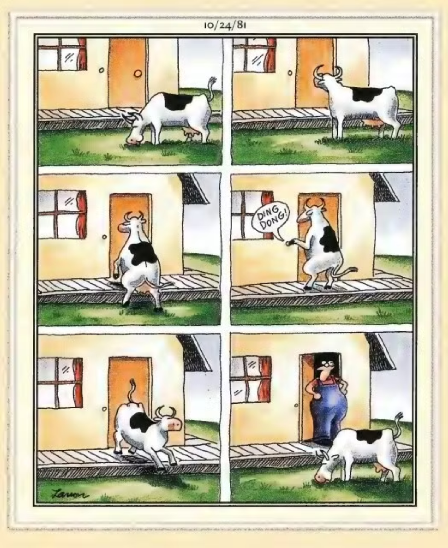 Este es quizás uno de mis favoritos Lado lejano Comics de todos los tiempos, como me recuerda a mi infancia y también presenta vacas, uno de mis animales favoritos en el planeta. En un raro panel múltiple Lado lejano Strip cómica, los fanáticos ven a una vaca tocando “Ding Dong Ditch” en su dueño. Sin embargo, a diferencia de los bromistas humanos, la vaca no necesita huir; Tiene la coartada perfecta simplemente por ser una vaca. Después de todo, ¿Quién sospecharía una vaca de zanjas de ding-dong? Personalmente era demasiado de un buen trabajo para probar esta broma con mis vecinos, pero este cómic me recordó de De vuelta en el corralLa serie de películas y televisión de Nickelodeon que definió mi infancia y también contó con vacas tirando bromas a humanos desprevenidos.