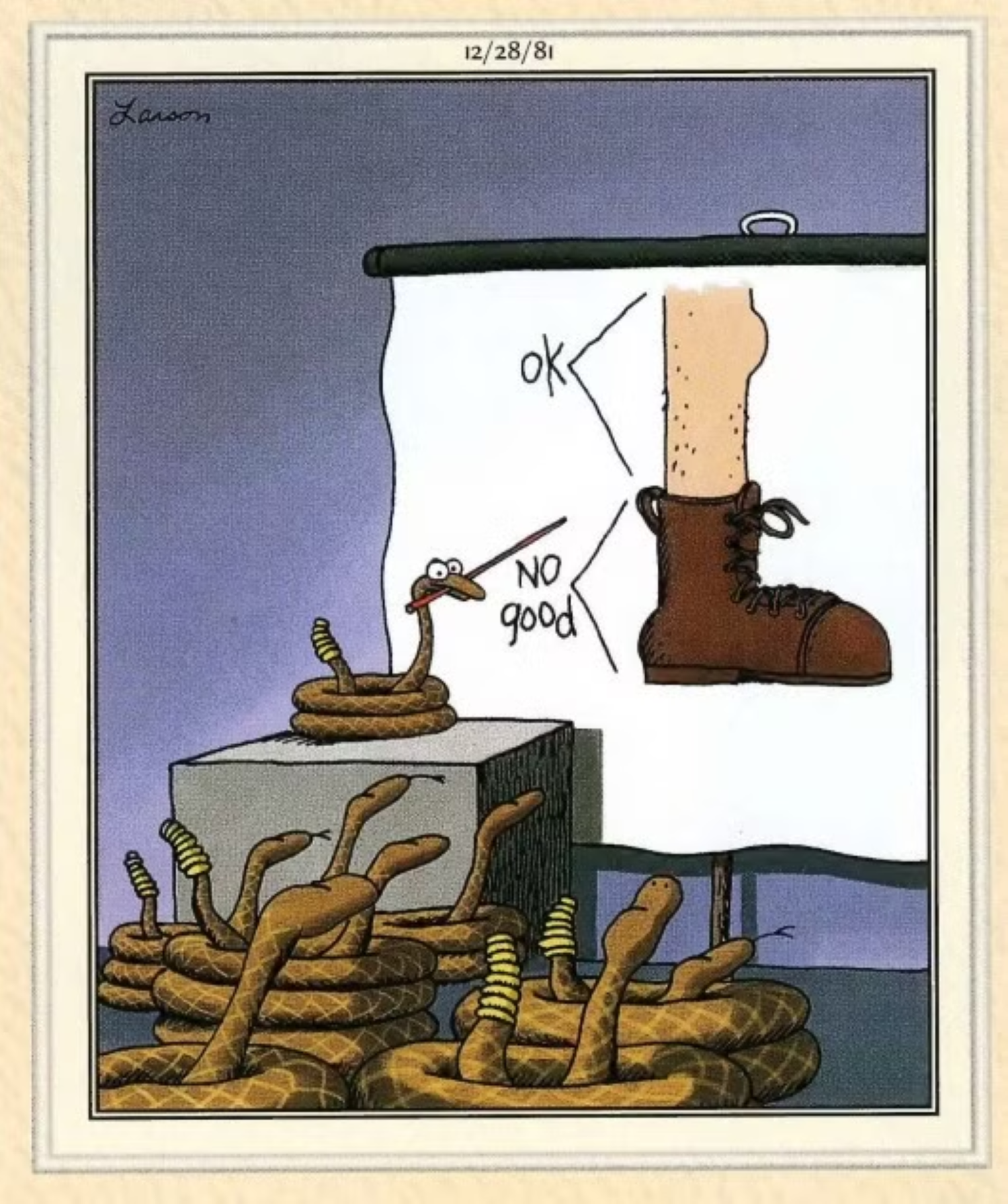 Soy un niño nacido en el desierto, y parte del crecimiento significaba que mis padres me perforaron constantemente la importancia de permanecer vigilante alrededor de las serpientes, especialmente las serpientes de cascabel. Esto fue particularmente crucial cuando fui en bicicleta de tierra en el desierto, ya que los encuentros con serpientes de cascabel no eran infrecuentes. Mis botas de acero no eran solo para proteger contra rocas, sino también serpientes. Este Lado lejano El cómic imagina hilarantemente a las serpientes que son muy conscientes del equipo humano, como Una serpiente da una conferencia de presentación de diapositivas sobre las zonas de mordida más segurasenfatizando que las botas están fuera de los límites. Aparentemente, las serpientes prefieren atacar a la pantorrilla o más, lo que de repente hace que su extraño objetivo en el mundo real se sienta muy intencional.