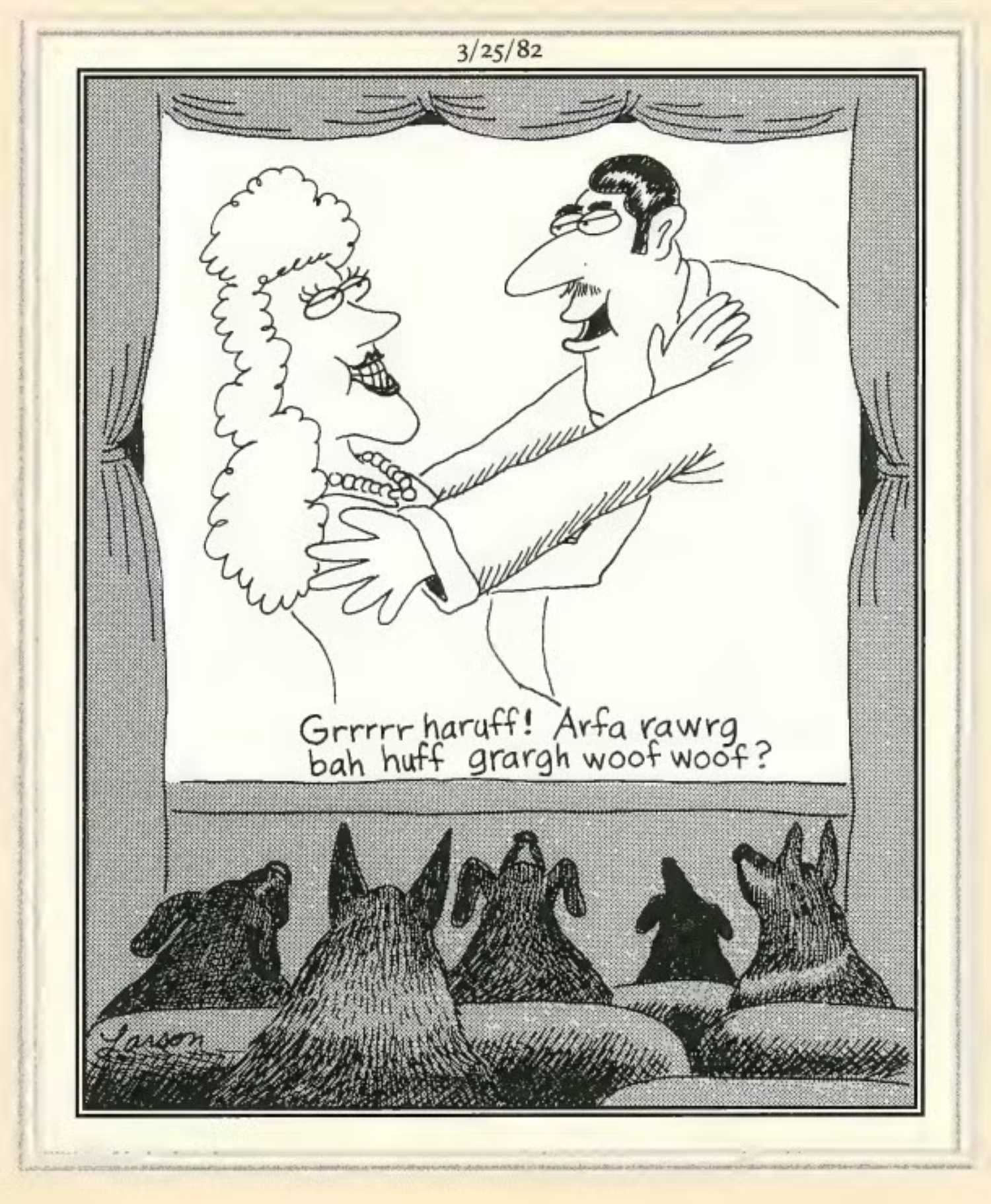 Aquí, Larson combina el concepto de películas internacionales con su amor característico por los animales. En los Estados Unidos, una película internacional generalmente se refiere a una producción extranjera con diálogo no inglés, a menudo acompañado de subtítulos en inglés. Larson voltea esta idea imaginando un “Película entre especies” dónde Los perros se sientan en un teatro viendo una película protagonizada por humanos, con subtítulos de discurso de perros proporcionadospor supuesto. Este giro inteligente no solo parodia la cultura cinematográfica, sino que también explora juguetonamente cómo los animales podrían percibir nuestro mundo si los roles fueran revertidos.