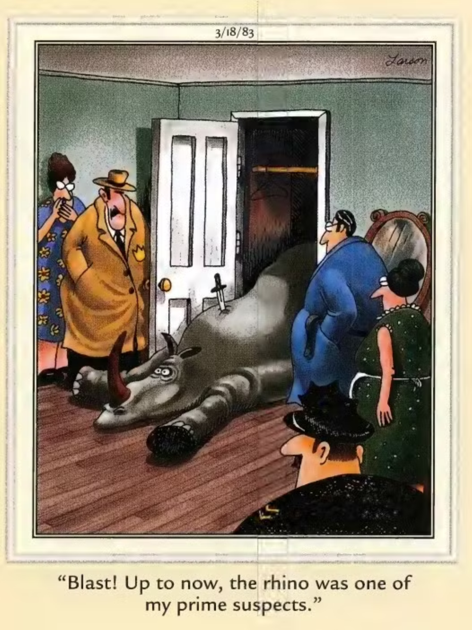Mientras El lado lejano A menudo presenta animales familiares familiares, Larson ocasionalmente le da a las criaturas exóticas su momento en el centro de atención. En este caso, un rinoceronte es la desafortunada estrella de un misterio de asesinato ridículo. Un detective anuncia dramáticamente, “¡Explosión! Hasta ahora, el rinoceronte era uno de mis principales sospechosos”. Justo cuando el rinoceronte cae de un armario con un cuchillo en la espalda. El humor se encuentra en el gran absurdo: ¿por qué el rinoceronte era un sospechoso? ¿Cómo encajaba en el armario? Este cómic no ofrece respuestas, pero eso es parte de la diversión.