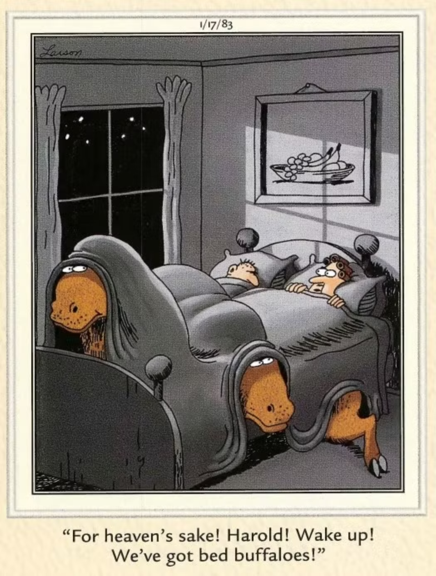 Las chinches son una de las peores pesadillas para cualquiera que se quede en una casa, hotel o apartamento. Una vez que están allí, son casi imposibles de deshacerse. Pero en esto Lado lejano cómic, Larson presenta un escenario aún peor: búfalos de cama. El humor probablemente proviene de una obra inteligente de palabras, combinando chinches con búfalos de agua y creando un nuevo y horrible híbrido. Estos búfalos no solo invaden su hogar; De alguna manera viven en tu cama. Es completamente ridículo, pero ese es el punto. Te deja preguntándose si necesitarías un exterminador o tal vez incluso un experto en vida silvestre para intervenir.