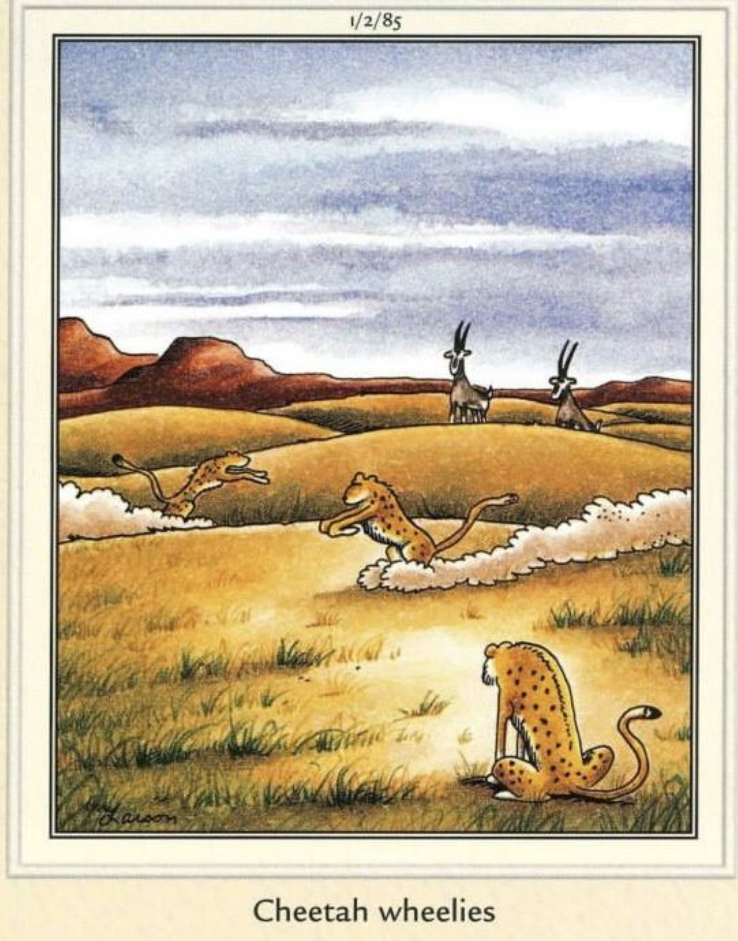 La mayoría de la gente ha visto a alguien hacer estallar un caballito, ya sea en una bicicleta o una motocicleta. Es un truco llamativo y arriesgado que se ve genial y toma equilibrio y confianza. En este cómic, Larson imagina cómo se vería en el mundo de los animales. Naturalmente, usa el guepardo, el animal terrestre más rápido, y lo coloca “a mitad de la rueda” en sus patas traseras en la sabana africana. Es una imagen ridícula, pero también extrañamente apropiada. Si alguien pudiera lograr el mejor truco para bicicletas, sería un guepardo. Este cómic ilustra cómo Larson combina los rasgos animales sin esfuerzo con comportamientos humanos para obtener resultados hilarantes.