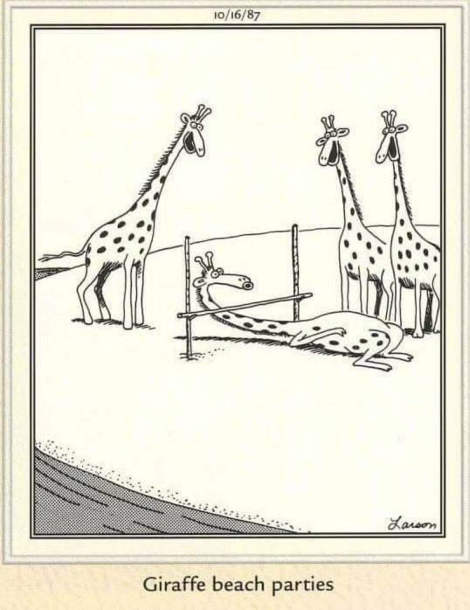 Este cómic es una mezcla perfecta del amor de Larson por los animales antropomórficos y el humor absurdo. Aquí, un grupo de jirafas se muestra de vacaciones, jugando con limbo en la playa. El limbo es lo suficientemente difícil para los humanos altos, por lo que ver las jirafas que lo intenta es hilarantemente inesperado. Aún mejor, Una de las jirafas se muestra a mitad de limo y lo hace sorprendentemente bien. Gira la suposición de altura y flexibilidad en su cabeza. Larson juega con la idea de que no debemos juzgar qué animales (o personas) tendrán éxito en ciertos juegos por cómo se ven. En este mundo, incluso las jirafas pueden dominar el limbo.