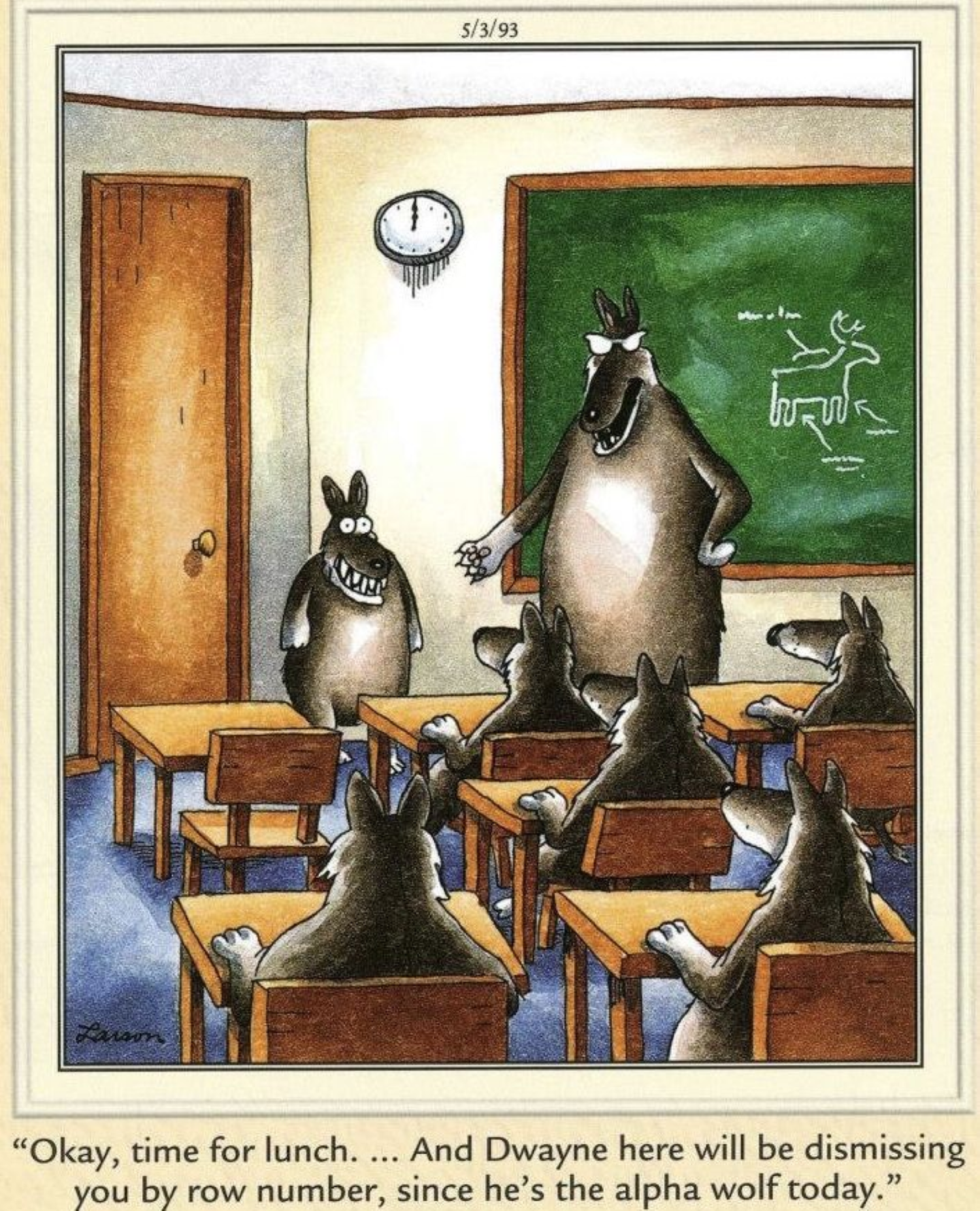 La mayoría de las personas recuerdan el papel del ayudante del maestro en la escuela, un puesto temporal pero enriquecedor en el que un estudiante pudo ayudar a liderar la clase. En esto Lado lejano Comic, Larson reinventa esa tradición en el reino animal. En lugar del ayudante del maestro, los lobos asignan un “Alpha Wolf del día “. Es una mezcla inteligente de comportamiento humano y jerarquía de animales, con la clásica dinámica de lobos de los lobos aplicados con humor a un aula. Este es un gran ejemplo de cómo El lado lejano Toma algo que la mayoría de nosotros damos por sentado, como los rituales de tiempo escolar, y lo combina con el comportamiento animal para crear oro de comedia.