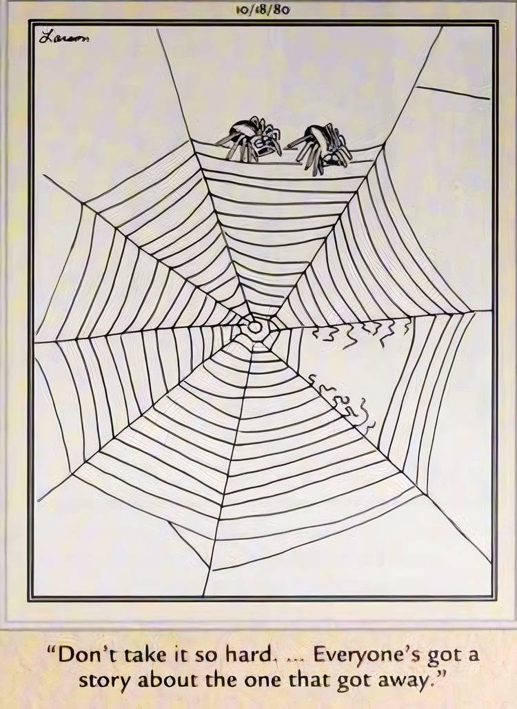 En este temprano Lado lejano Caricatura de araña, dos arácnidos sentados sobre una de sus redes. Una sección de la cual ha sido rasgada, las hebras rotas cuelgan en la brisa, mientras uno consuela al otro, diciendo: “Todo el mundo tiene una historia sobre el que se escapó..”