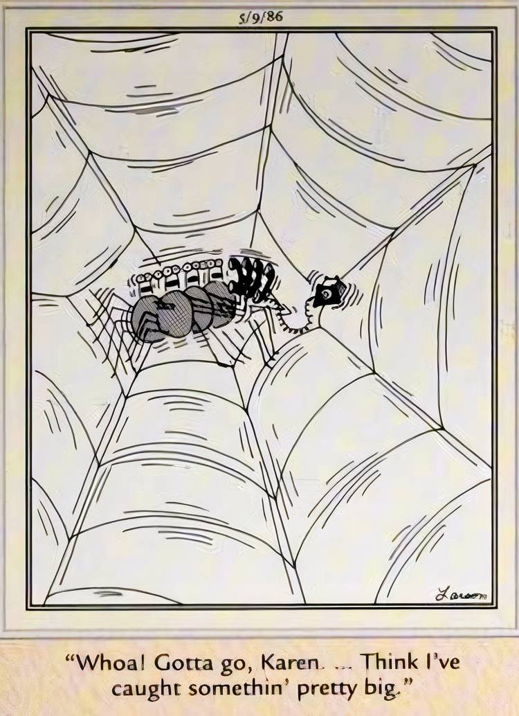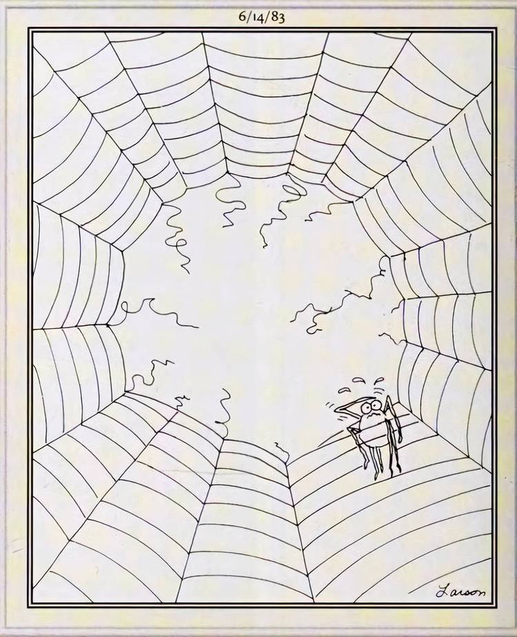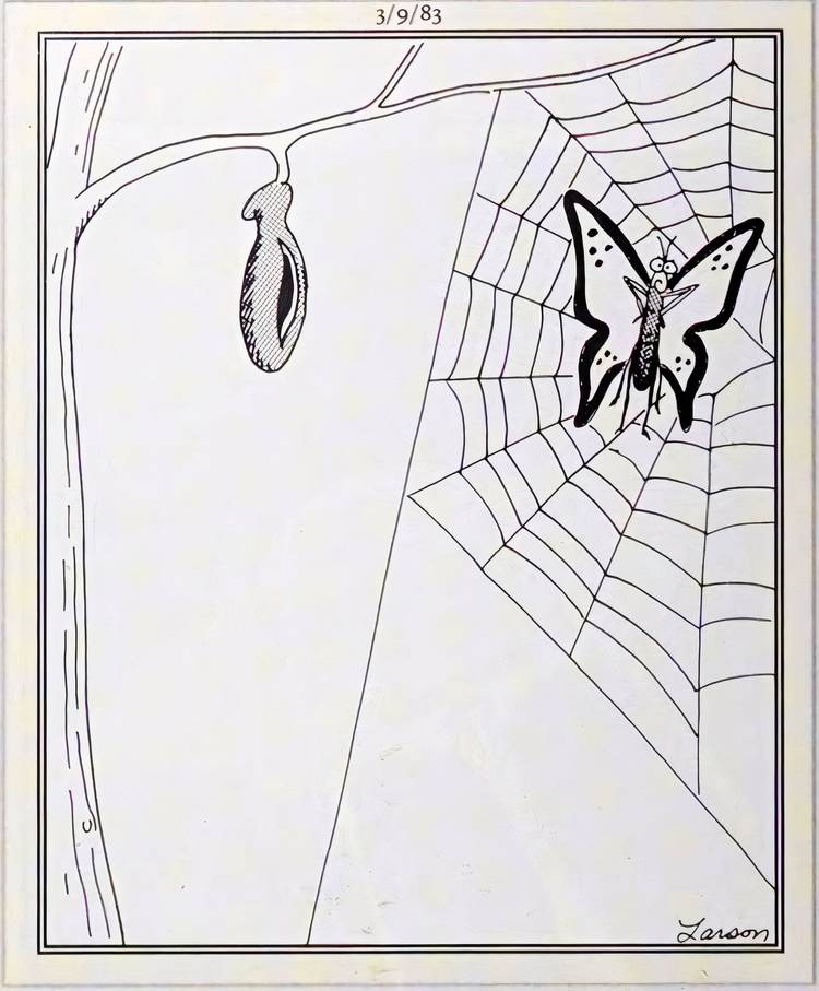 Aquí, Gary Larson describe sin palabras una sombría peculiaridad del ciclo de la vida, mientras una oruga recién metamorfoseada emerge de su capullo para comenzar su vida como una hermosa mariposa, solo para encontrarse rápidamente atrapada en una telaraña adyacente.