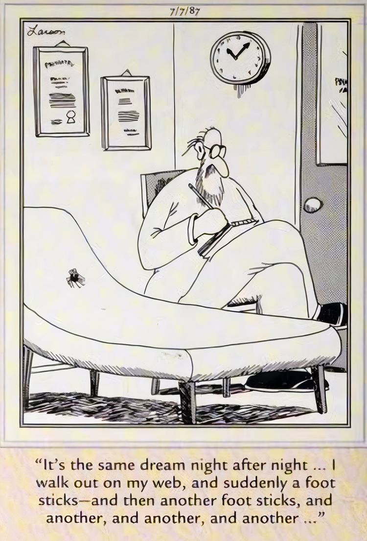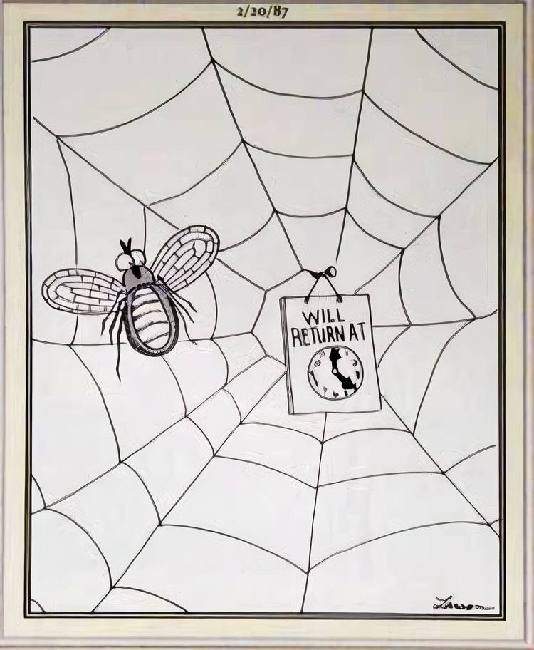 Una vez más, en este panel, Gary Larson utiliza la ausencia de la araña para aumentar su amenaza y, en general, utiliza el motivo de “atrapado en una red” para contar una broma sobre el tormento de esperar lo inevitable. Como muchos de sus antecesores, Una desafortunada mosca se encuentra atrapada en una telaraña, obligada a mirar con horrorizada anticipación el cartel pegado en el centro de la telaraña, que dice “Regresará a las 4 p.m..”