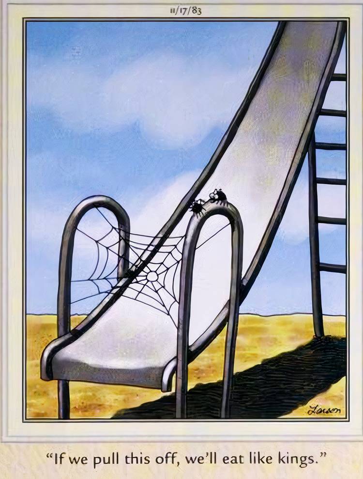 Esta hilarante Lado lejano El panel de la araña presenta a dos arañas planeando el mayor golpe de sus vidas, mientras Esperan atrapar a un niño humano tejiendo una red en el fondo de un tobogán de un patio de juegos, y uno de ellos comenta: “Si lo logramos, comeremos como reyes.“