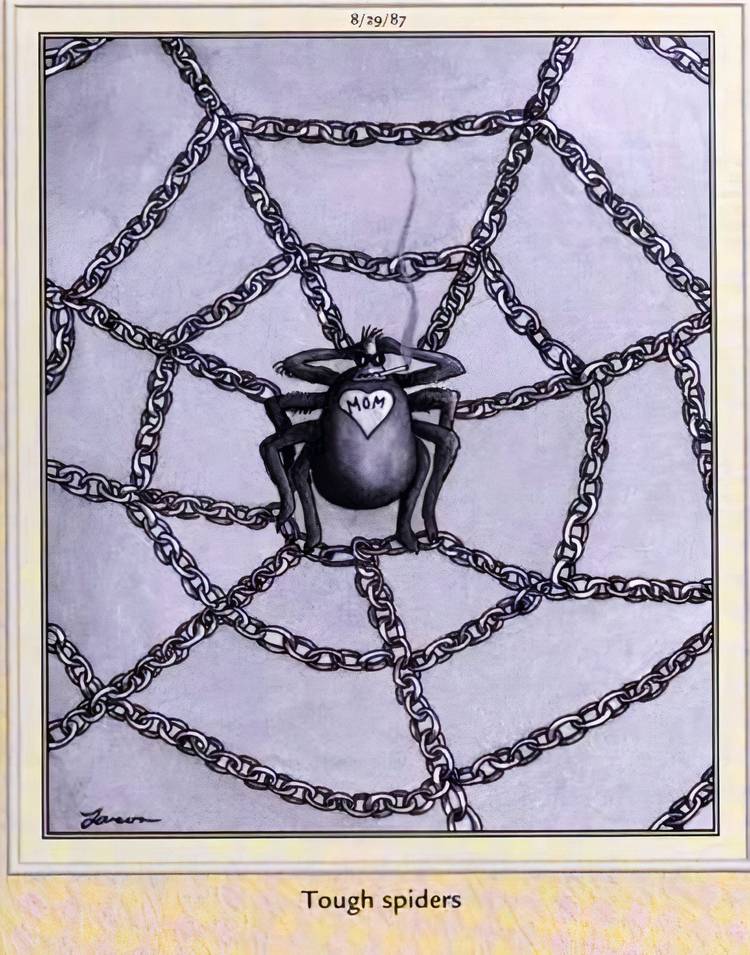 Ciertamente, este es uno de los arácnidos más absurdos. Lado lejano cómics, que representa una araña con un “Mamá“tatuaje de un corazón en el pecho, fumando tranquilamente un cigarrillo mientras se relaja en el centro de una red hecha de cadenas. Capitaneando la imagen”arañas duras“Gary Larson traduce ingeniosamente la concepción popular de un individuo rudo y revoltoso en forma de araña.