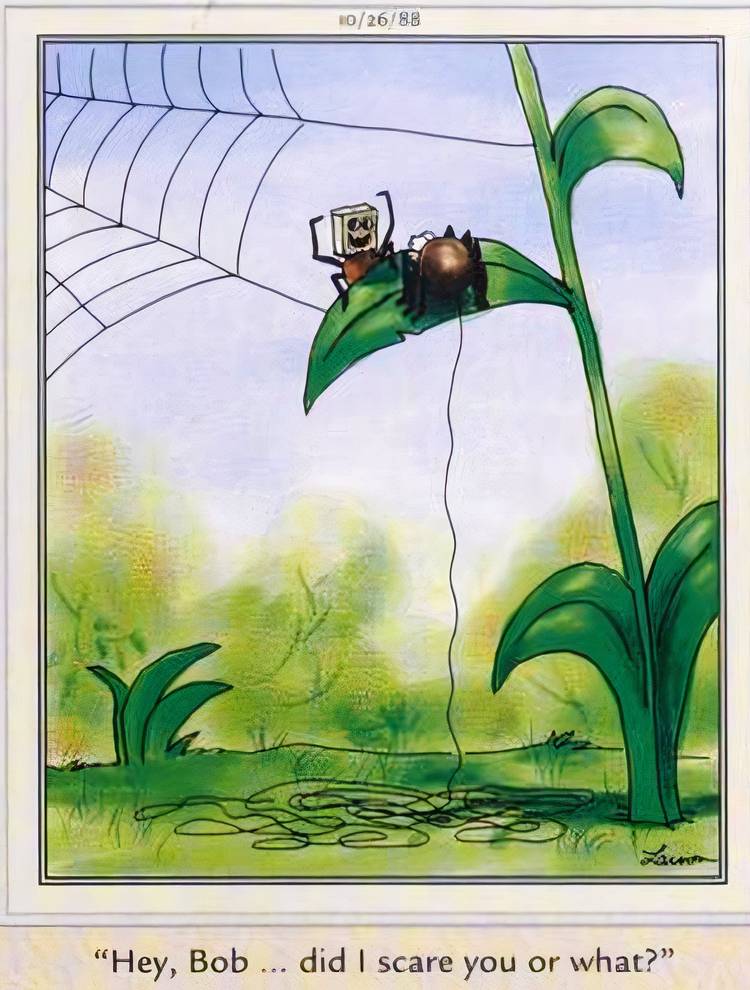 Una vez más, el humor aquí gira en torno a los ojos de la araña; aunque Gary Larson no se dedicó a antropomorfizar completamente a las arañas con tanta frecuencia como lo hizo con otros animales e insectos, tendió a dibujarlas con cierta apariencia de humanidad, para permitir al lector un punto de conexión. En este caso, en lugar de ojos arácnidos inhumanos, la araña aquí tiene globos oculares parecidos a los humanos, bien abiertos en señal de sorpresa.