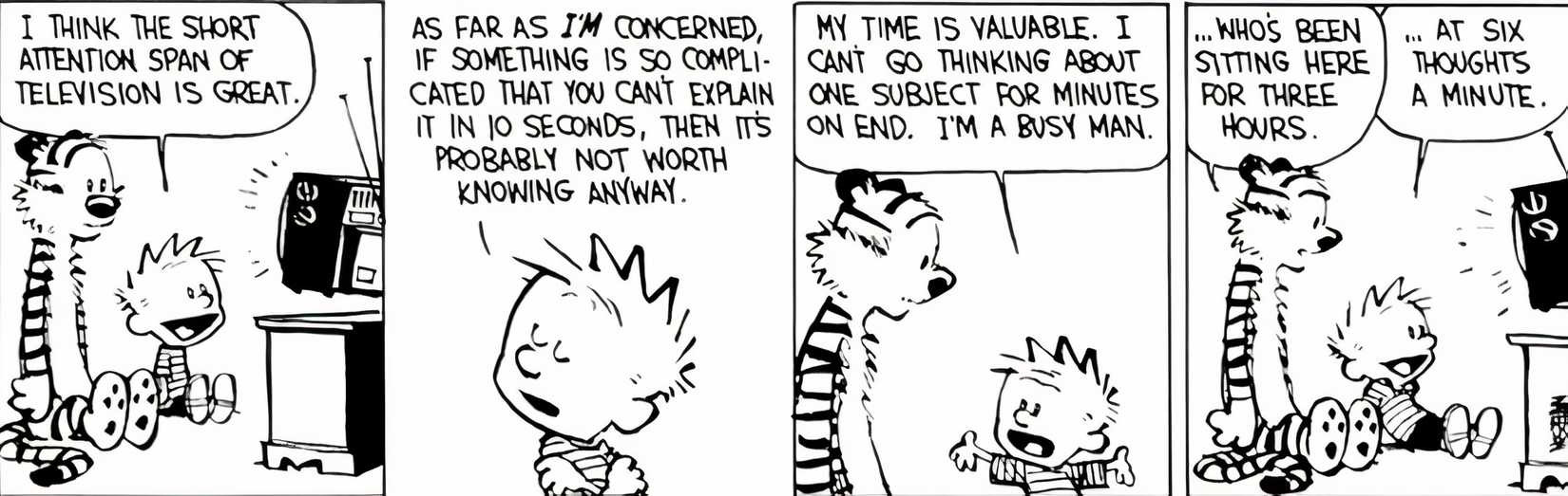 “Creo que la corta capacidad de atención de la televisión es genial.“Calvin le dice a Hobbes en esta tira; explica que no tiene tiempo para nada tan complicado que lleve más de diez segundos explicarlo. Divertidamente, El argumento de Calvin se basa en la premisa de que un período de atención más corto le permite pensar en más cosas, más rápidamente. – distorsionando por completo la lógica tradicional de la atención.