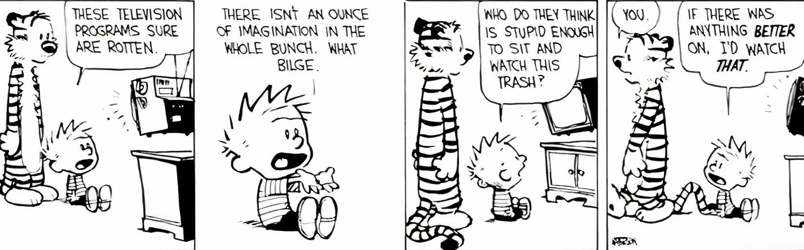 En este Calvin y Hobbes En el cómic, Calvin ataca duramente el programa de televisión que está viendo y lo llama “podridoy carente de imaginación, y afirmando que el público al que va dirigido el programa debe ser poco inteligente. Naturalmente, Hobbes señala que Calvin es precisamente el público objetivo al que está degradando. – a lo que el niño responde que sólo lo ve por falta de programación de mayor calidad.
