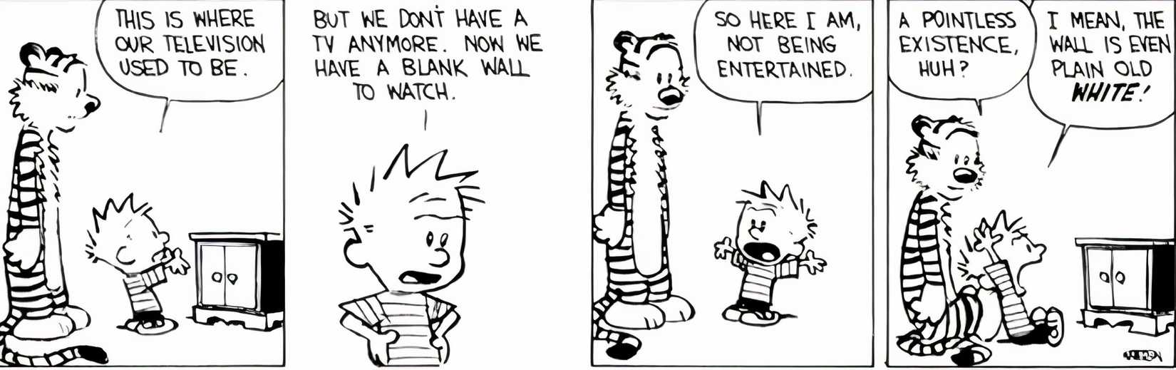 En este cómic, Calvin se enfrenta a una pérdida trágica, después de que le arrebataran su amado televisor, dejándole solo “Una pared en blanco para miraren su lugar. “Así que aquí estoy, sin entretenerme,Calvino se lamenta, a lo que Calvino se compadece llamando a su nueva vida “Una existencia sin sentido” – comentando hilarantemente sobre la dependencia de Estados Unidos de los medios y el entretenimiento, algo que sólo se ha vuelto más evidente en los treinta y cinco años transcurridos desde esto. Calvin y Hobbes La tira fue publicada.